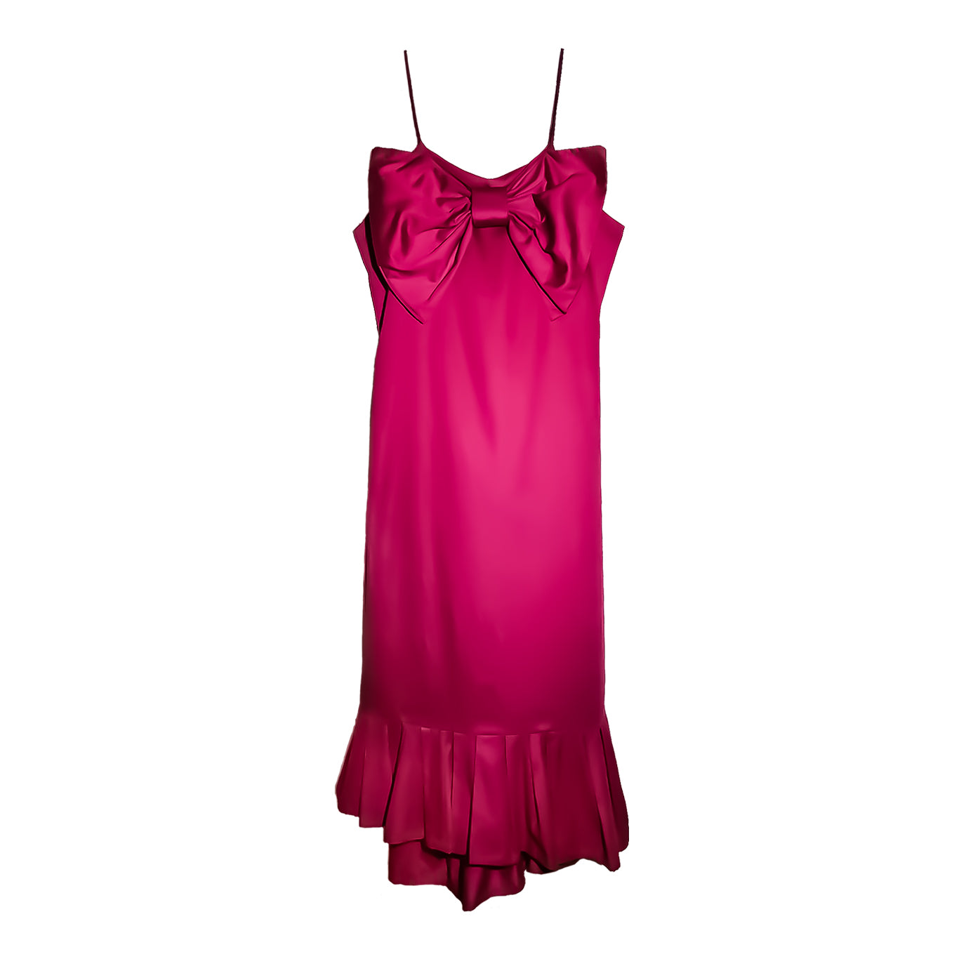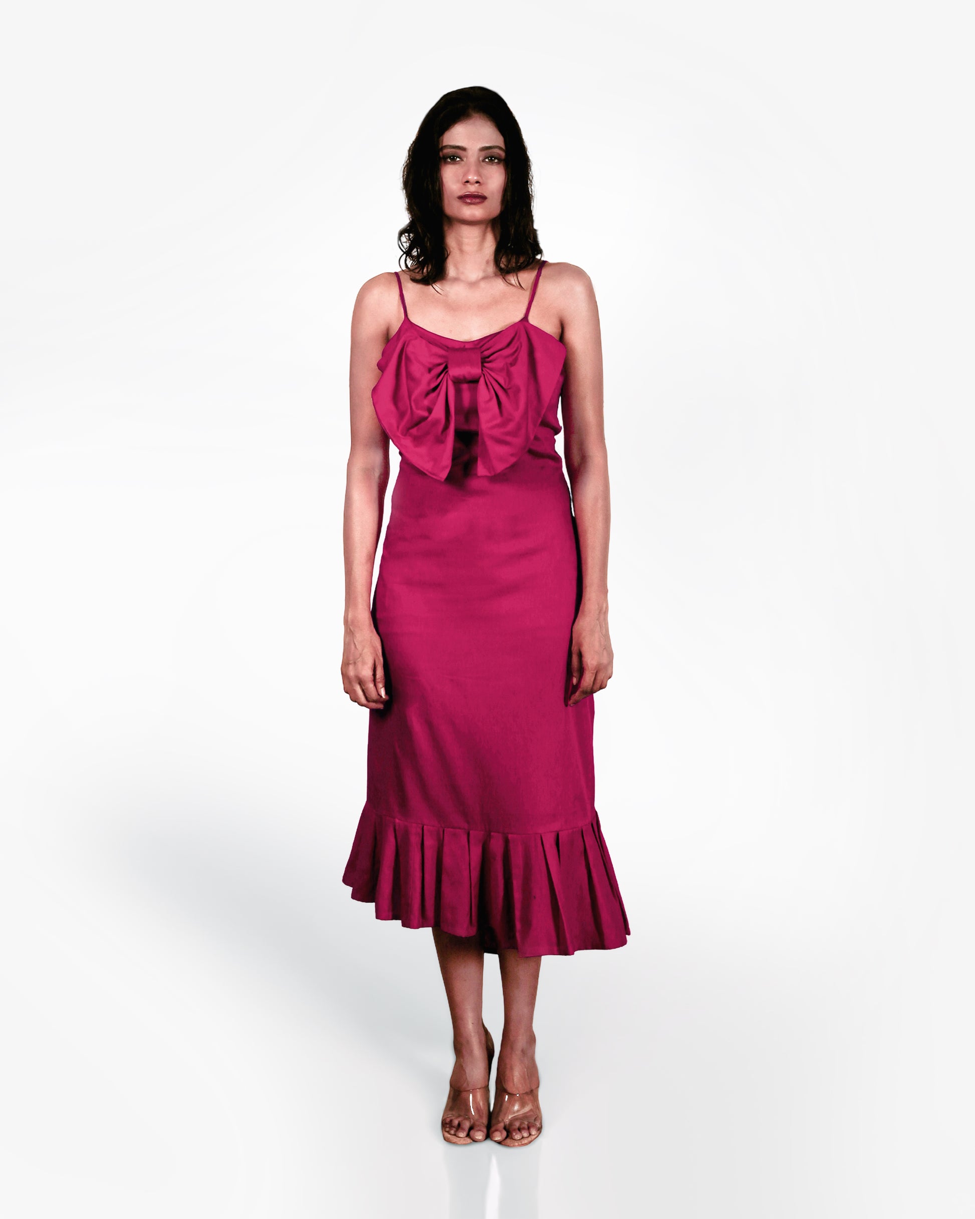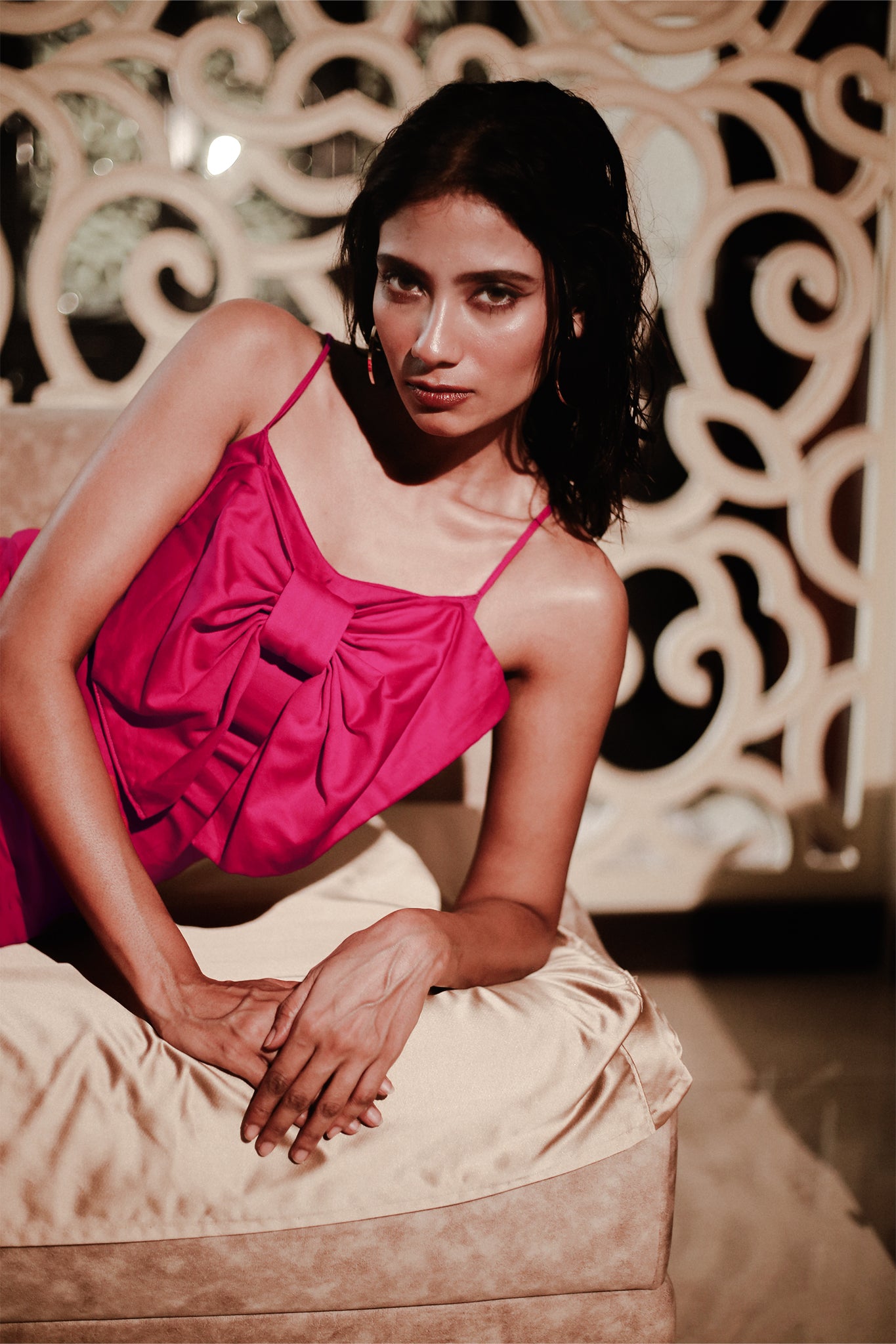 An elevated essential with sculptural detail, Bow Down is crafted in premium cotton satin — a breathable, structured fabric chosen for both comfort and form. A carefully sculpted bow crowns the neckline, folding soft volume into precise symmetry. The body-skimming silhouette finishes in a flounced hem that moves with ease, creating a rhythm of play and poise.