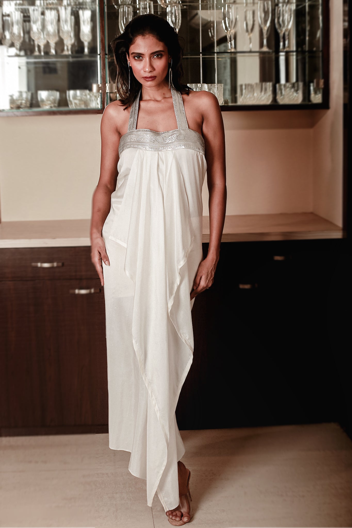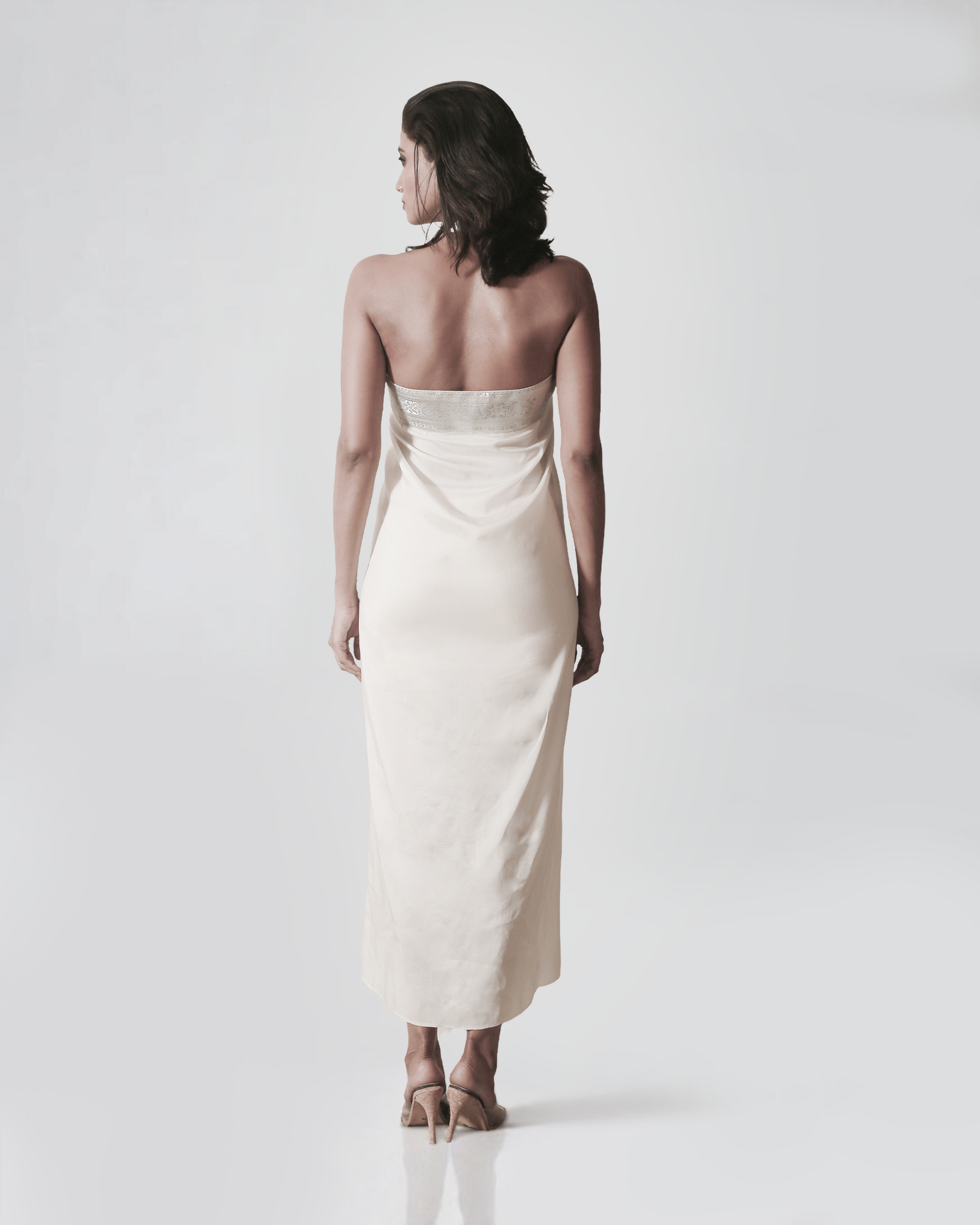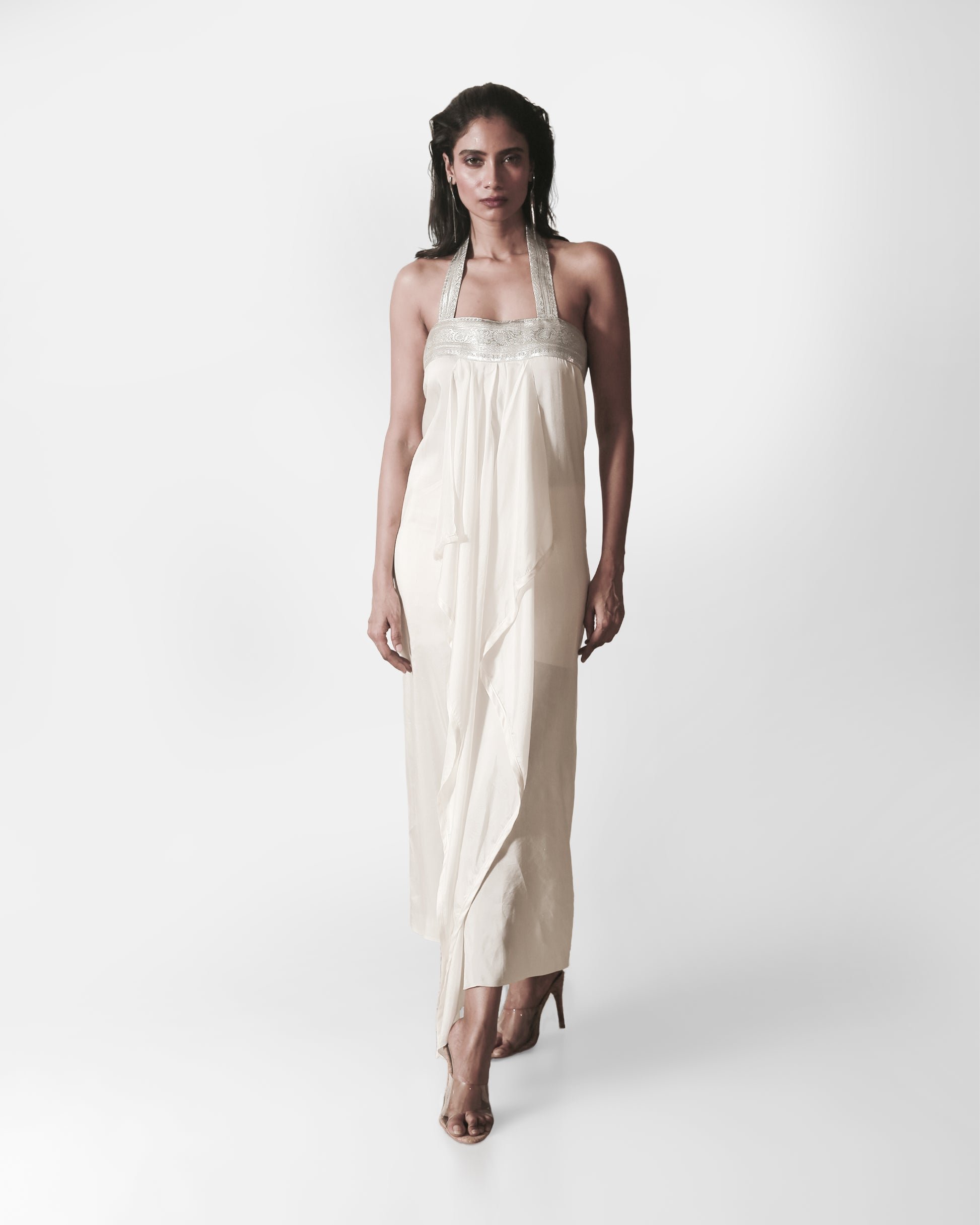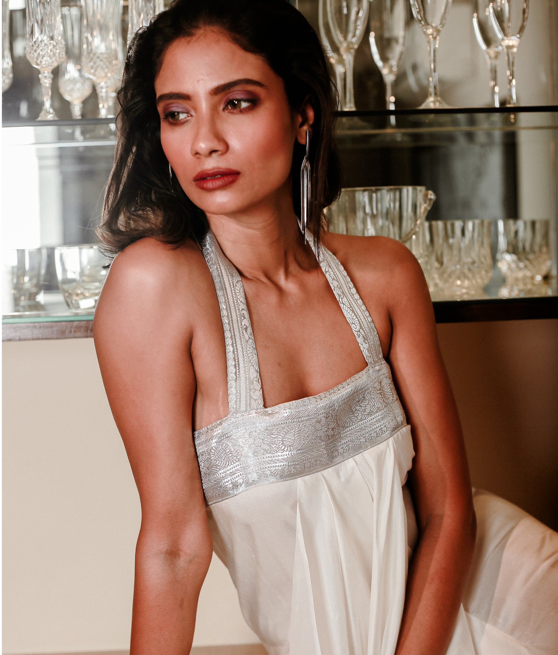 This ivory draped midi dress flows like light — a minimal, sculpted halter-neck silhouette accentuated by an intricately woven silver brocade trim.Crafted using seamless construction techniques, Ivory Drip is designed to minimise material waste and preserve the natural fall of pure silk. The strapless back and halter neckline allow the brocade to shine uninterrupted, while the silhouette gently tapers into a fluid midi length.