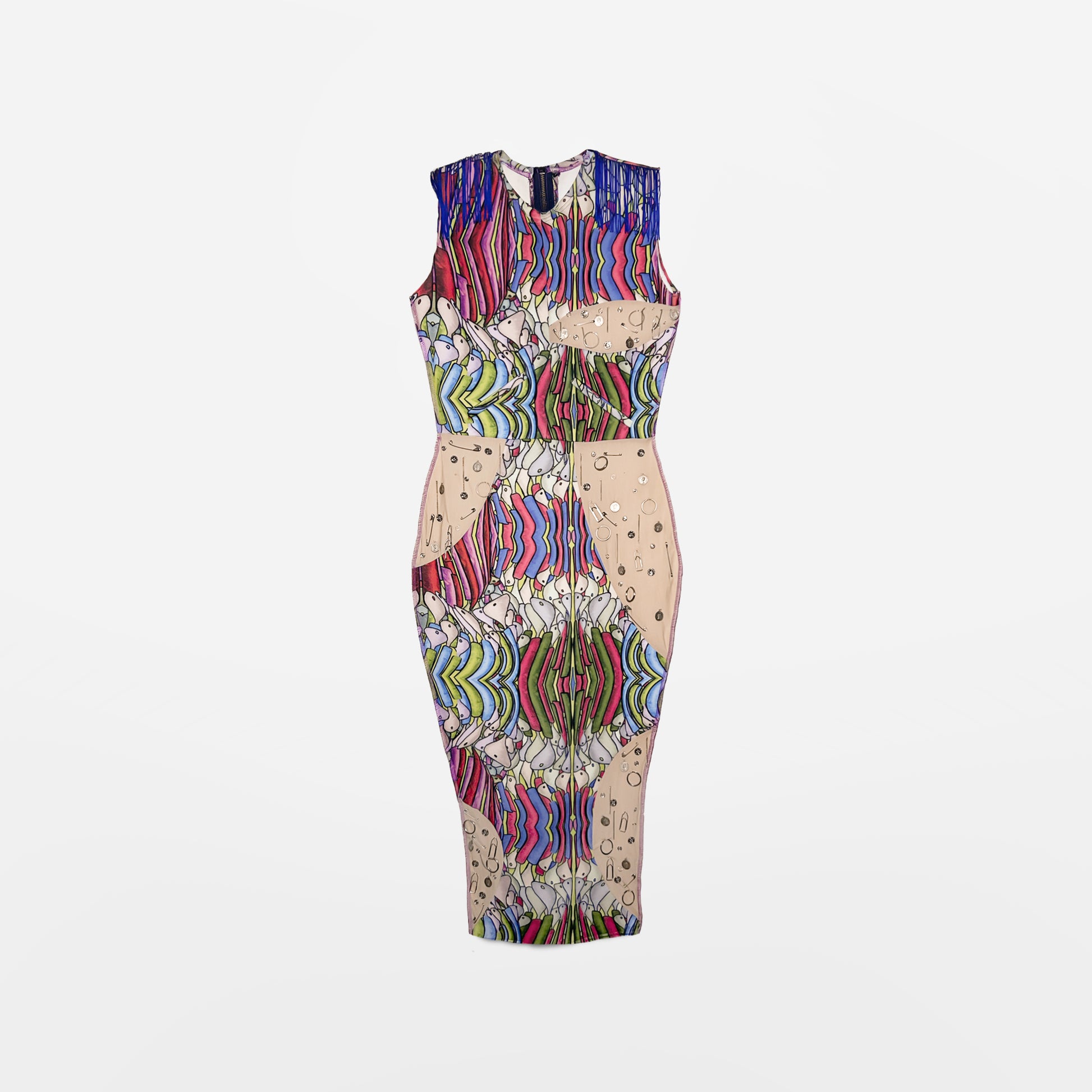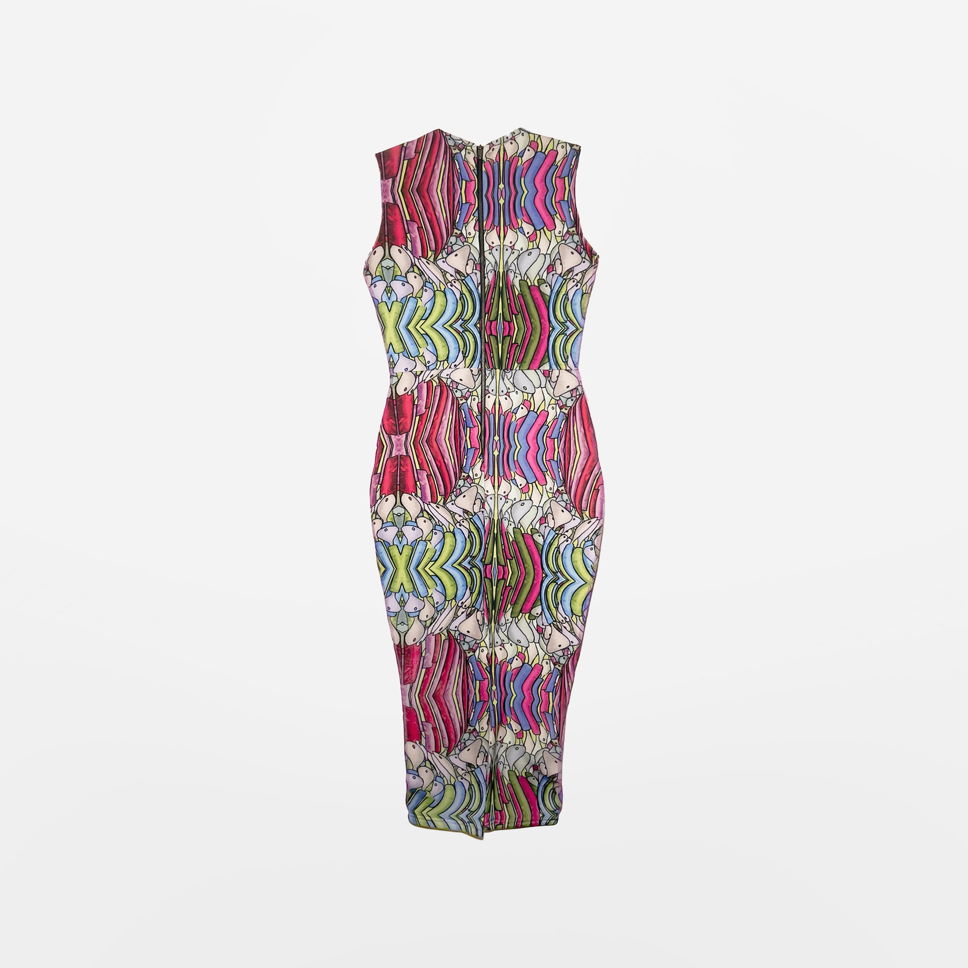 Body-contouring sheath dress cut from digitally custom printed scuba with power net panels for stretch and comfort. The silhouette is clean and minimal, with a round neckline and an exposed zip at the back for easy wear.