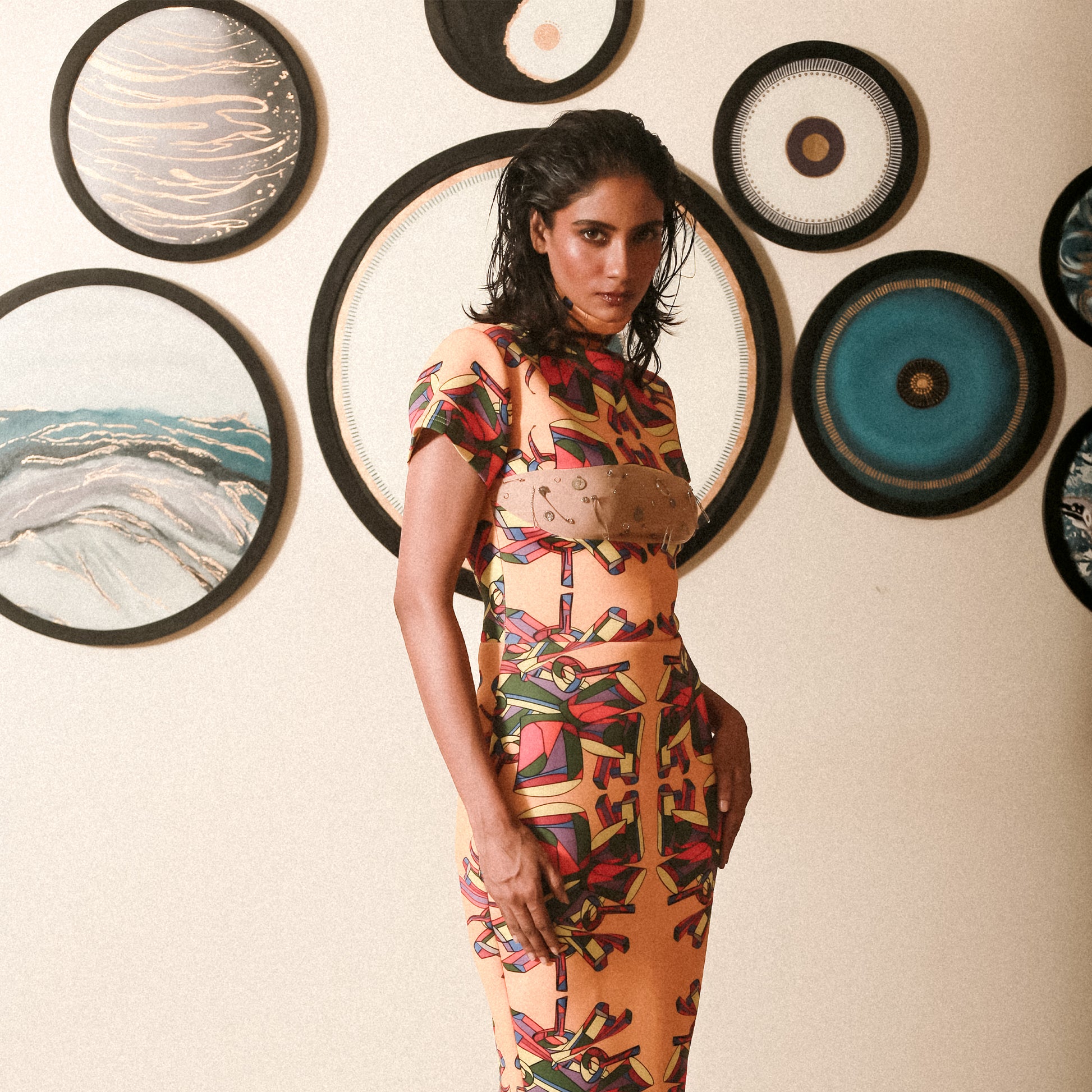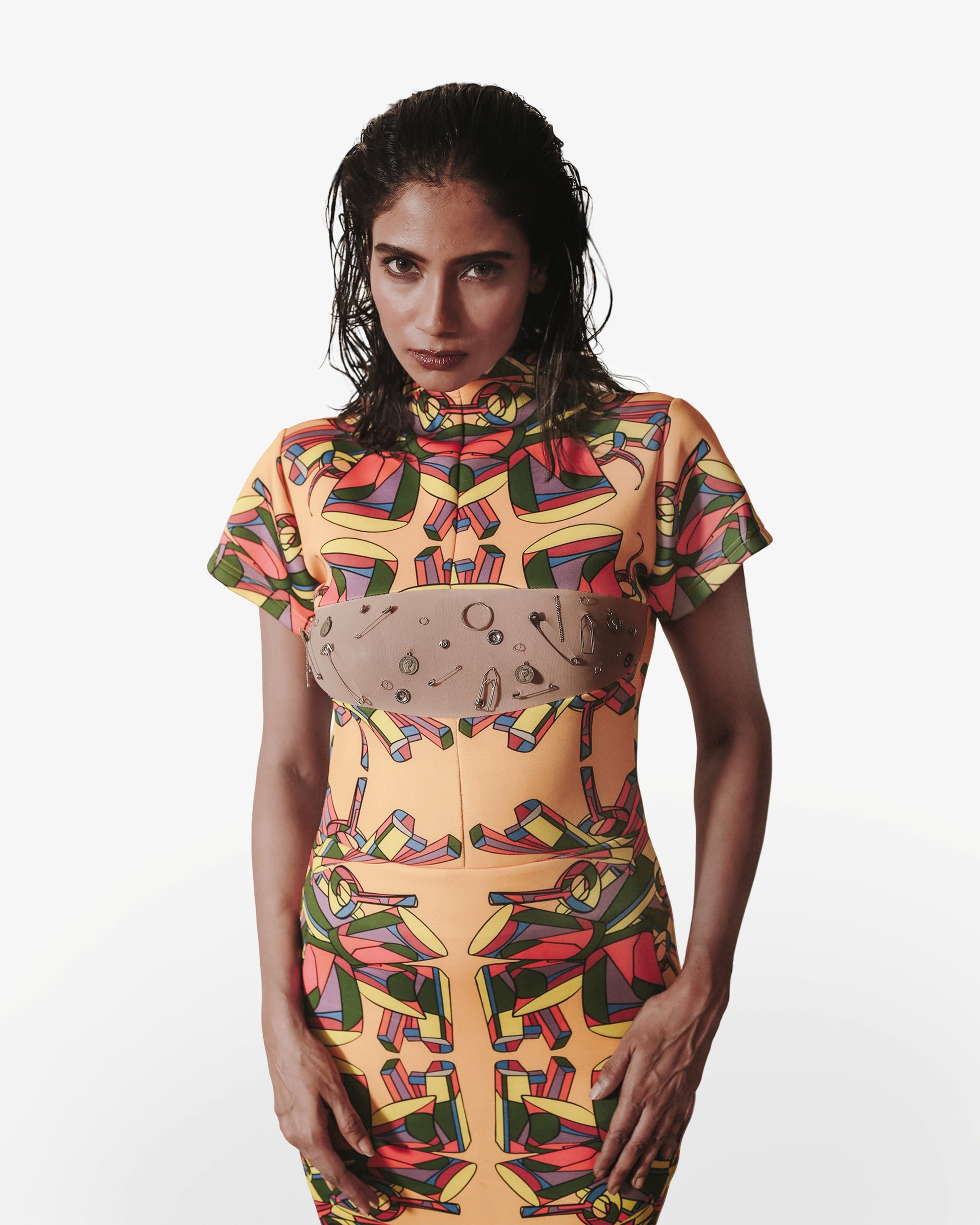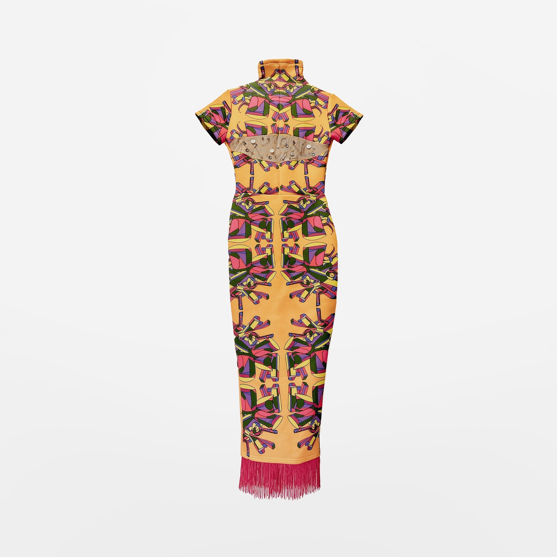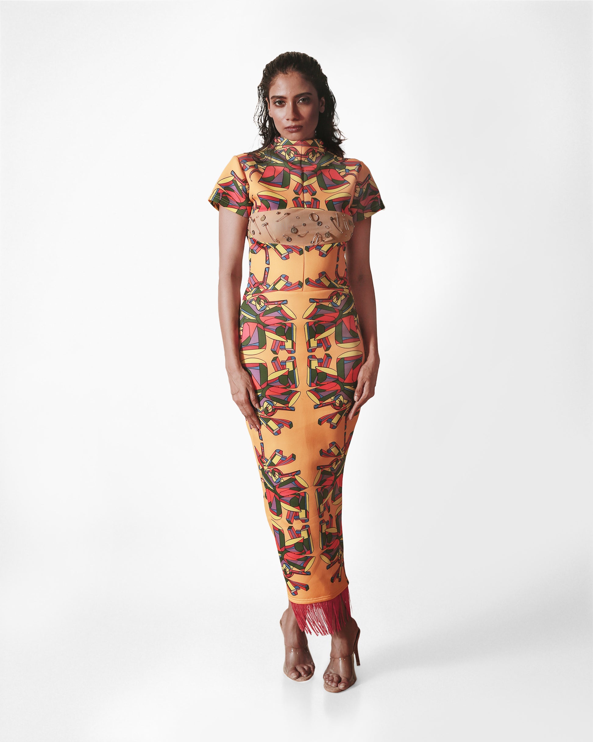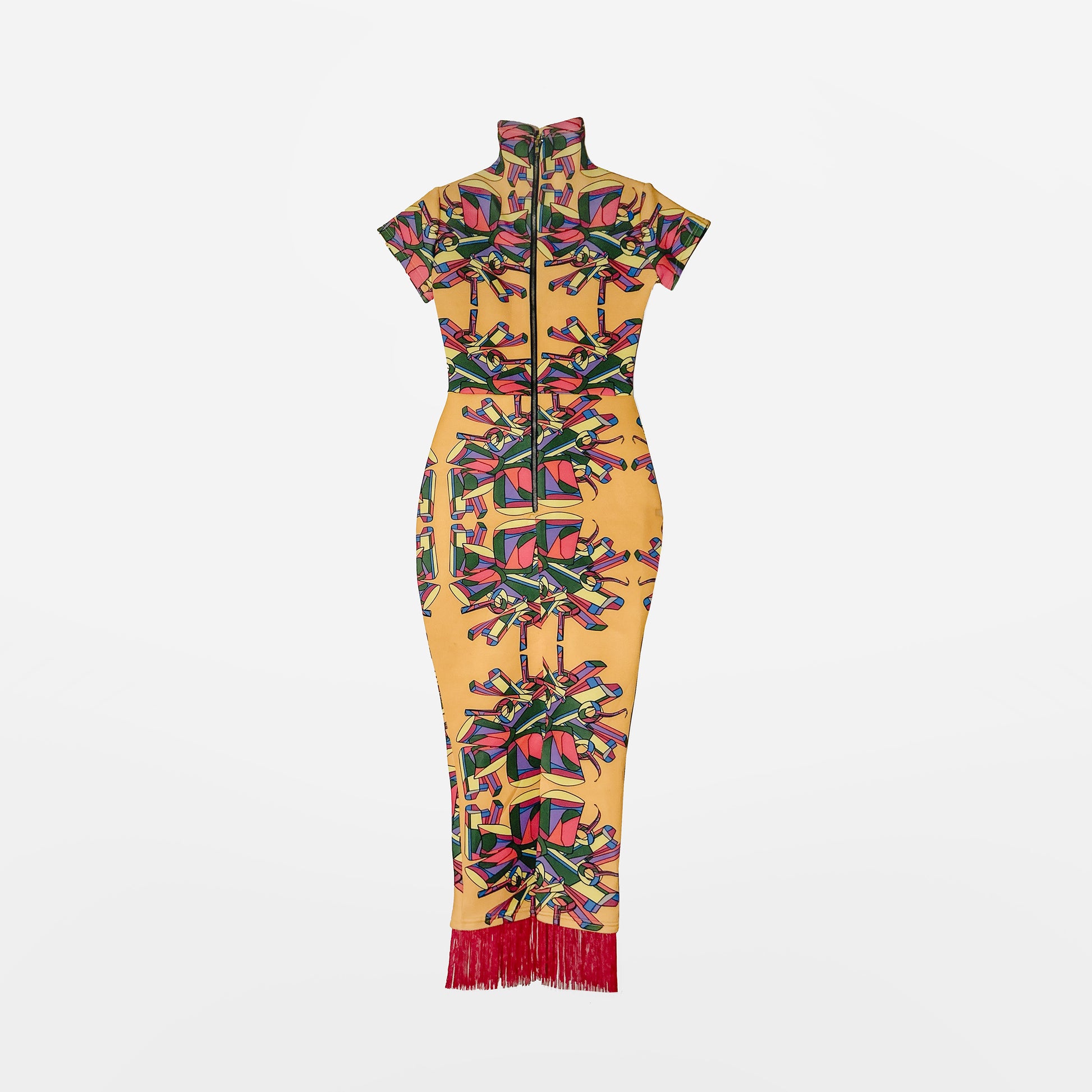 Tailored in a contoured silhouette with custom cubist-inspired prints, it features a sheer nude panel at the chest — hand-applied with metallic elements for depth, texture, and visual cadence. Structured cap sleeves frame the shoulders, while a sharp fringe hem and exposed back zip lend contrast and movement.