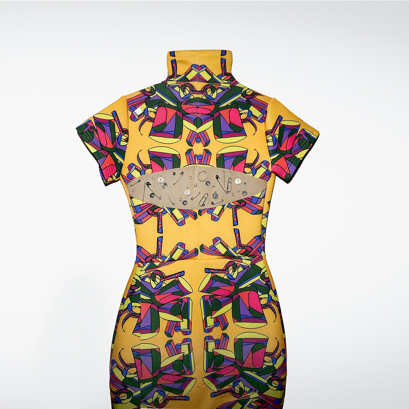 From the Unfamiliar Beings collection, this vivid sheath dress channels graphic precision and tactile artistry.