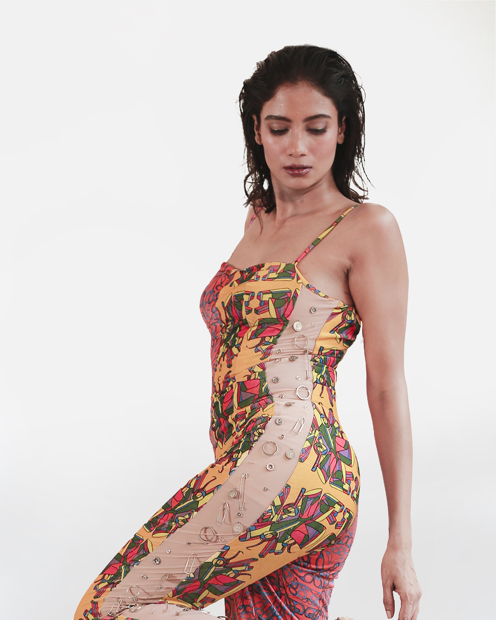 Along the nude mesh panels, metal SOTs — including rings, pins, and chains — are meticulously hand-applied to create a striking interplay of texture and visual rhythm. With a clean back zip closure, this limited-edition design merges bold geometry with tactile detailing, made for statement occasions and art-led environments.