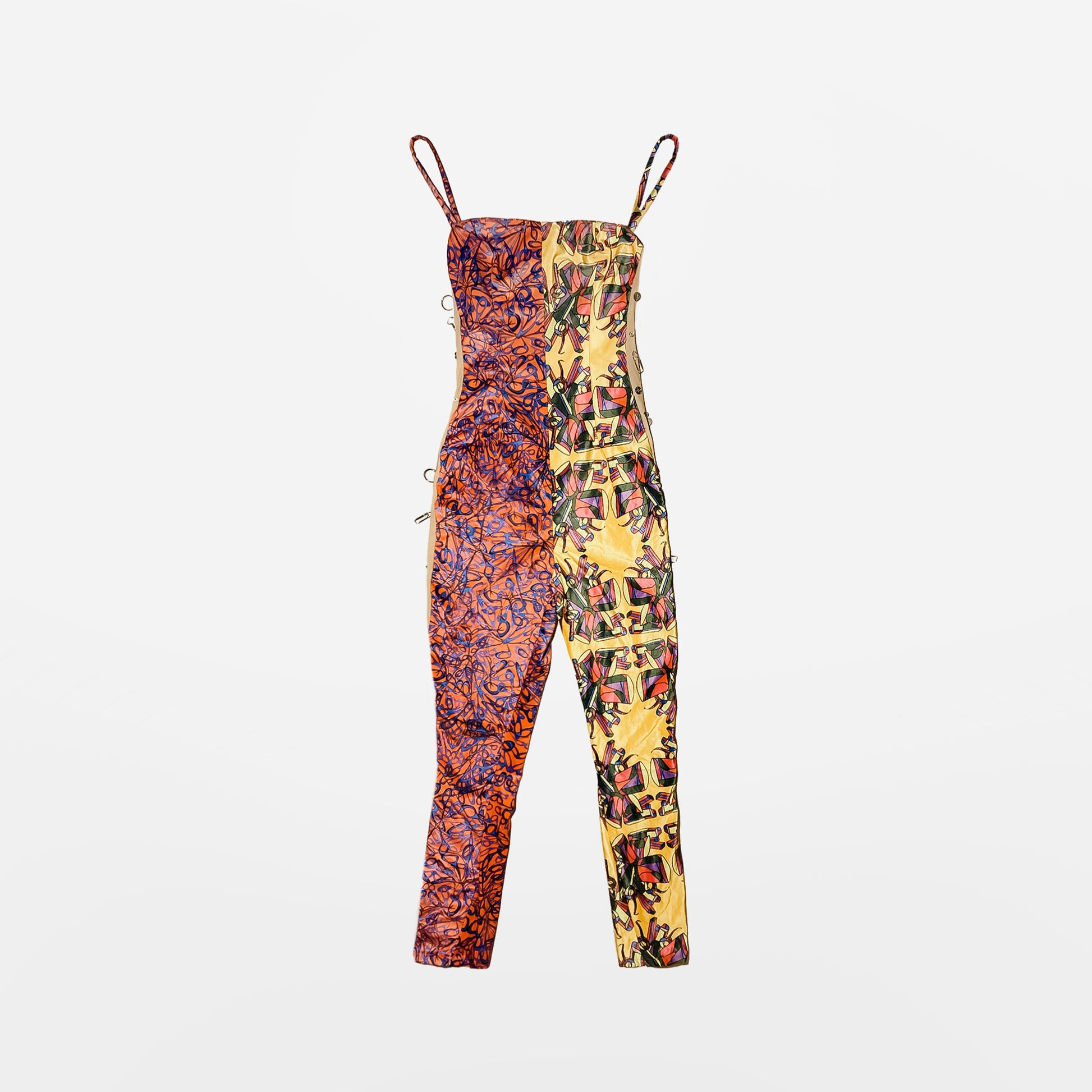 Cut in digitally printed suede with sheer power net inserts, this bodycon jumpsuit features cami straps and a sharply tailored silhouette that enhances definition and elongation.